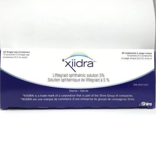 Xiidra (generic name: lifitegrast ophthalmic solution) is prescribed to treat the eye condition known as Dry Eye Syndrome (keratoconjunctivitis sicca.) This condition occurs when tears produced by the tear glands don’t provide enough lubrication or are inadequate and unstable. The lacrimal glands (tear glands and tear ducts), located above the eyeball, continuously supply tear fluid that is wiped across the surface of the eye with every blink. When testing to determine the cause of dry eyes, doctors may include: A full eye examination A measurement of the volume of tears (known as the Schirmer test or the phenol red thread test.) A test of the quality of the tears, including evaporation times. A tear osmolarity test to measure the composition of tears. In people with dry eye syndrome, there will be lower levels of water in the tears, elevated matrix metalloproteinase-9 or decreased lactoferrin. Dosage Doses should be taken exactly as prescribed by the doctor.